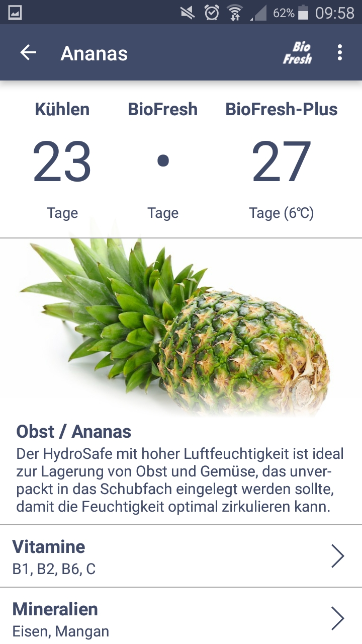 Die kostenlose App „BioFresh“ zeigt Dir welche Vitamine und Mineralien in Deinen Lieblingslebensmitteln stecken und wie lange Du sie nach dem Kauf im Kühlschrank aufbewahren kannst, bevor sie schlecht werden. In der App lernst Du allerhand wissenswertes zu Lebensmitteln und Inhaltsstoffen. Gibts für Android und Apple.
