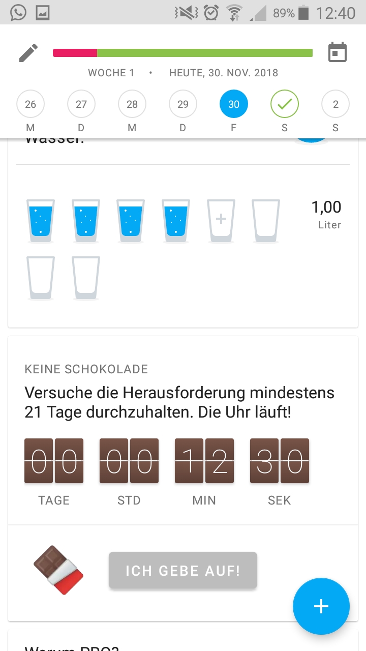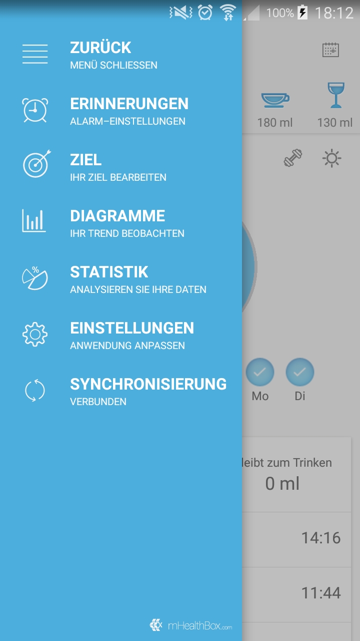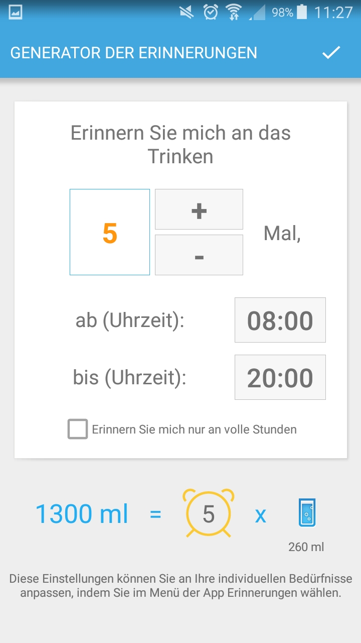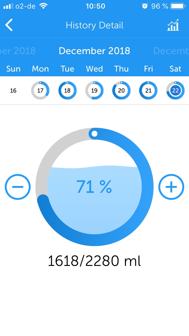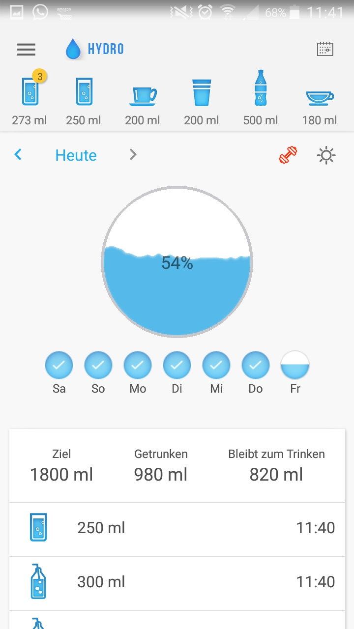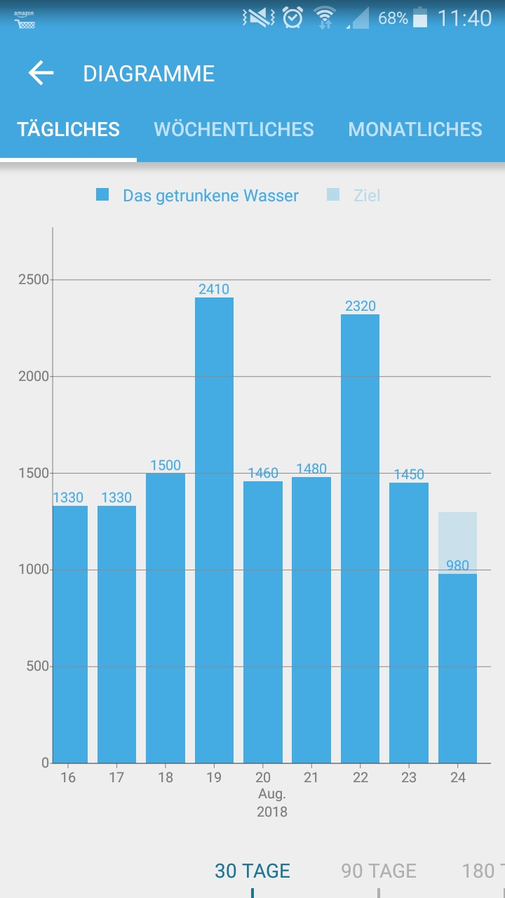 Mit der App „Drink Water“ kann das Trinkverhalten über den Tag protokolliert werden. So kann man ein Gefühl dafür bekommen, welcher Wasserbedarf vorhanden ist und wie dieser erreicht werden kann. Gibts für Android und Apple.