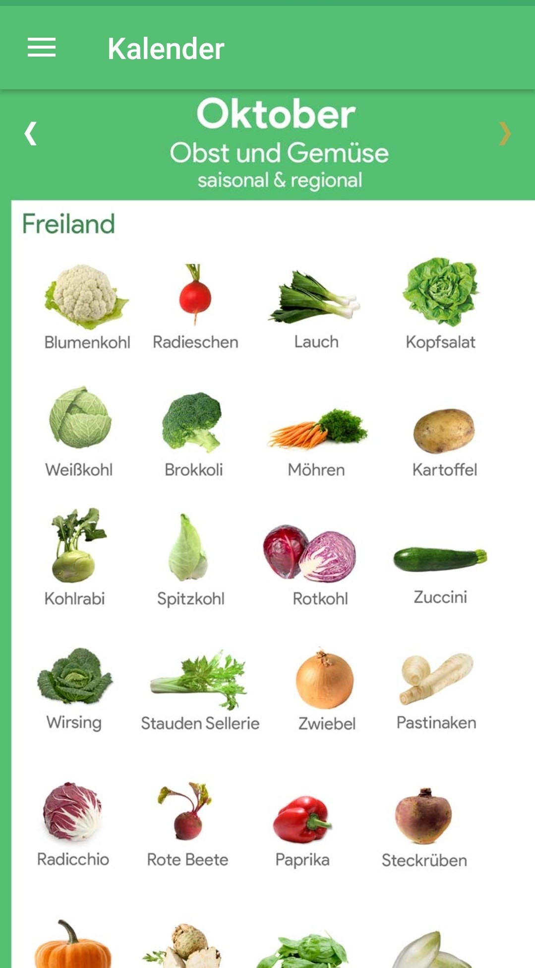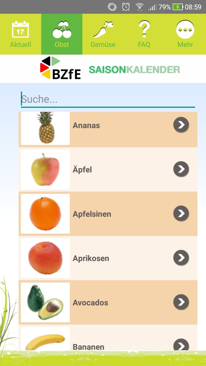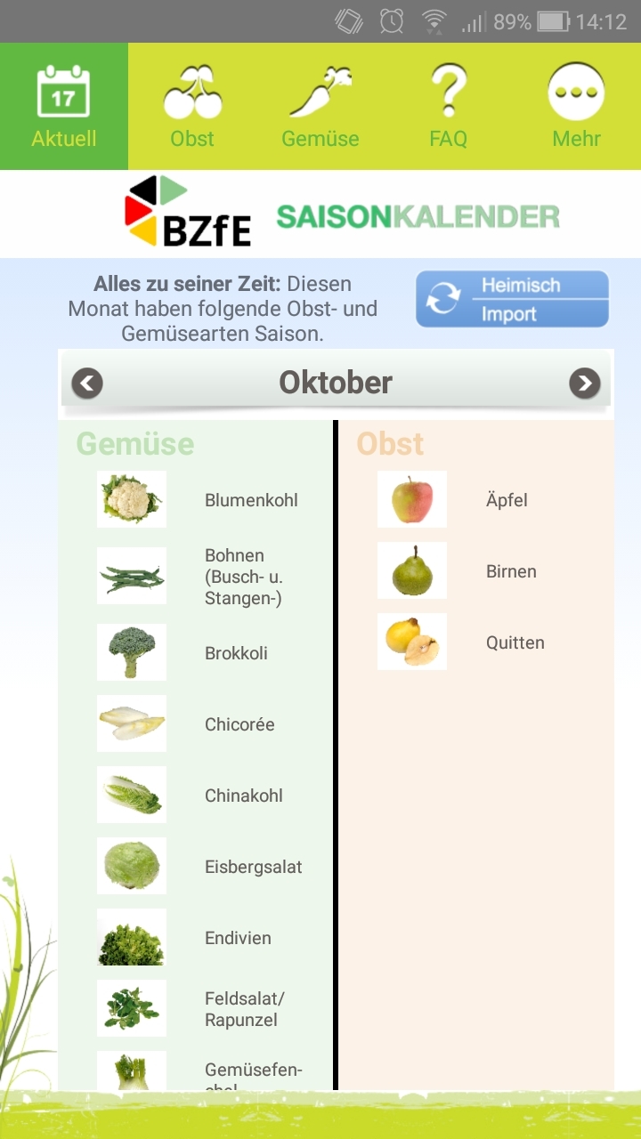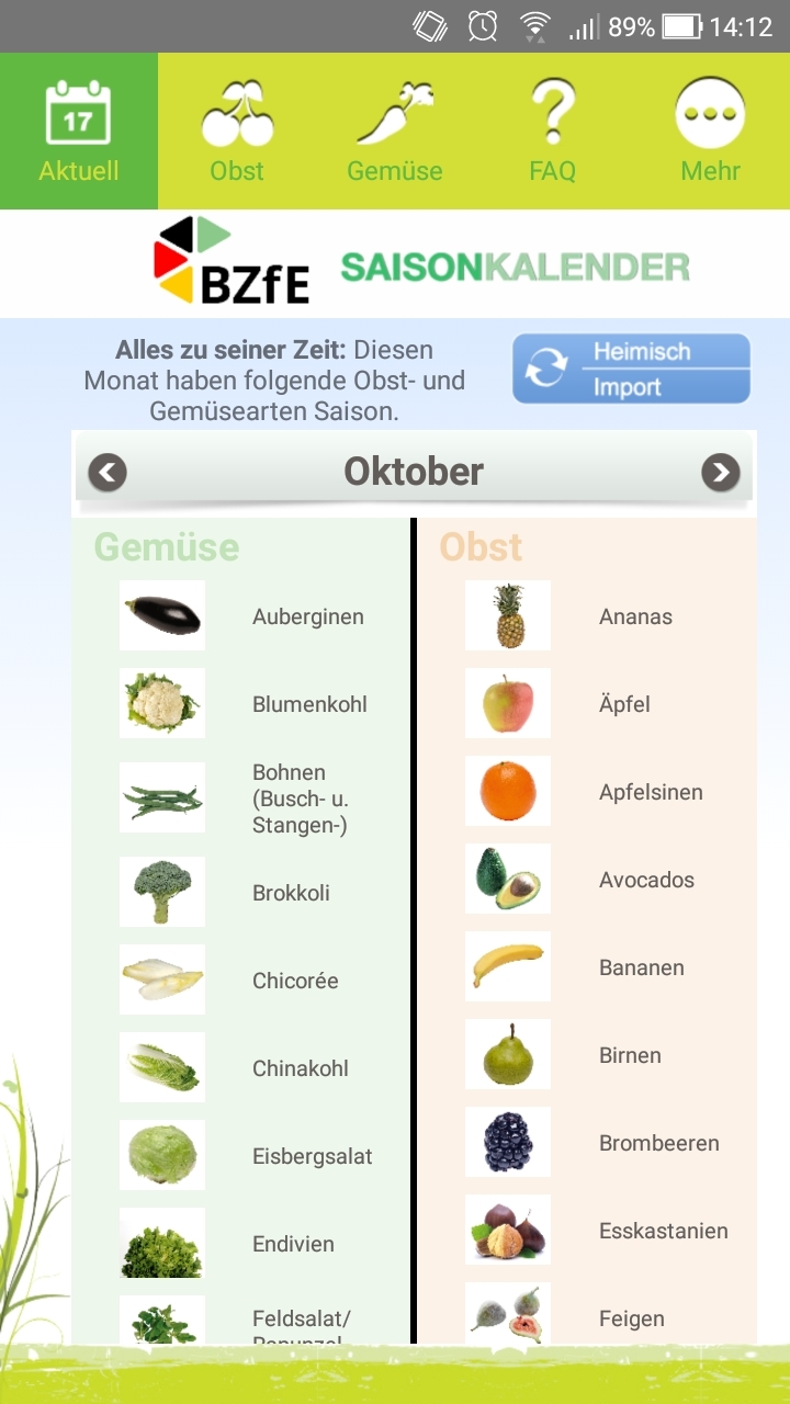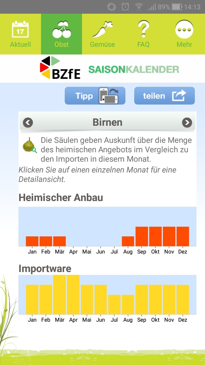 Wann gibt es Birnen, Beeren und Co. aus Deutschland und wann werden diese importiert? Wann haben Brokkoli und Kohlrabi Saison? Die App „Saisonkalender des Bundeszentrums für Ernährung“ (BZfE) hilft bei diesen Fragen und gibt Monat für Monat Informationen zum jeweiligen Angebot von über 70 Obst- und Gemüsesorten. Gibts für Android und Apple.