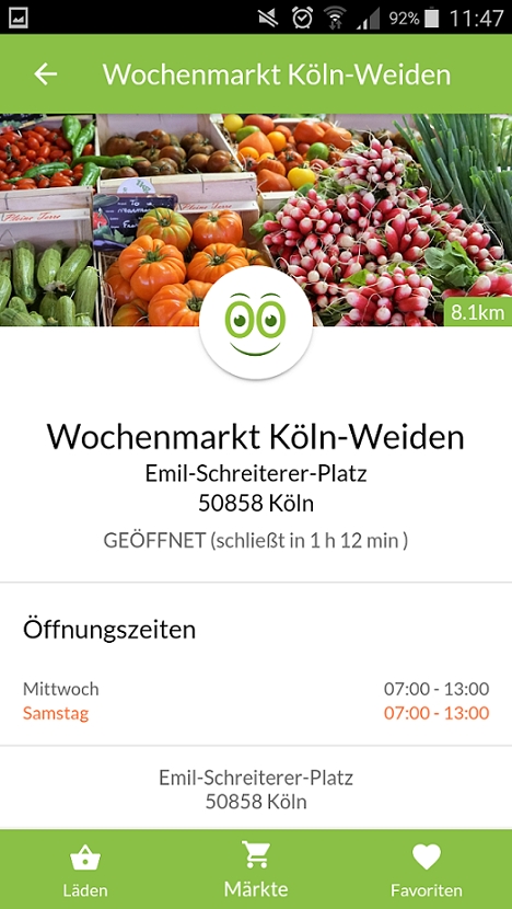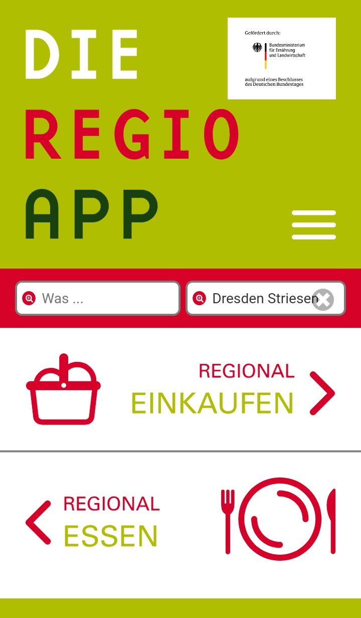 Die kostenfreie, deutsche App „RegioApp“ hilft Dir dabei, regionale Lebensmittel in der Nähe zu finden. Sie wird gefördert vom Bundesministerium für Ernährung und Landwirtschaft und liefert Informationen darüber, welche Geschäfte Lebensmittel anbieten, die in der Nähe angebaut und verarbeitet werden. Öffnungszeiten der Geschäfte werden ebenfalls mit dargestellt. Über die Rubrik „Regional essen“ erfährst Du, welche Lokalitäten mit regionalen Produkten kochen. Gibts für Android und Apple.