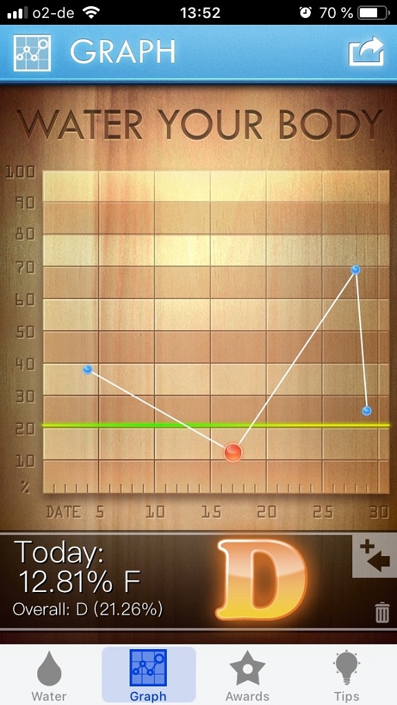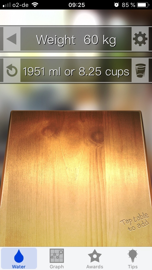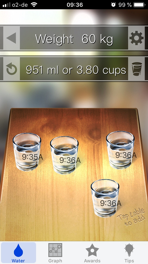 Mit der App „Water Your Body“kannst Du Dir einen Überblick über Dein Trinkverhalten verschaffen, indem Du einträgst, wie viel Wasser Du trinkst. Die App zeigt dann an, wie viel Wasser noch getrunken werden muss, um den Tagesbedarf zu decken und somit gesünder zu leben. Gibts nur für Apple.