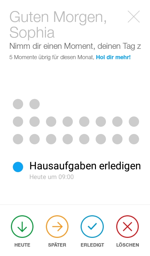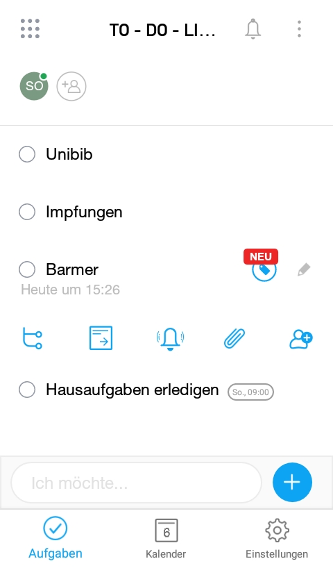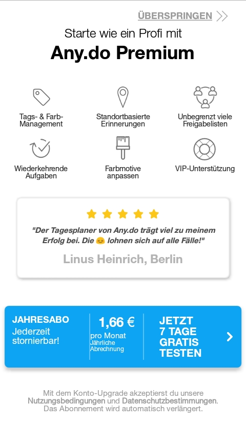 „Any.do“ ist eine zum Teil kostenlose To-Do-Organizer-App. Mit der App lassen sich Listen erstellen sowie Kalender, Erinnerungen und Tagesplaner verwalten. In einer Premium Version gibt es zusätzlich tolle Features wie Teamwork, Standortbasierte Erinnerungen und die Synchronisation der Aufgaben mit allen Deinen Geräten (auch Web und Tablet). Gibts für Apple und Android.