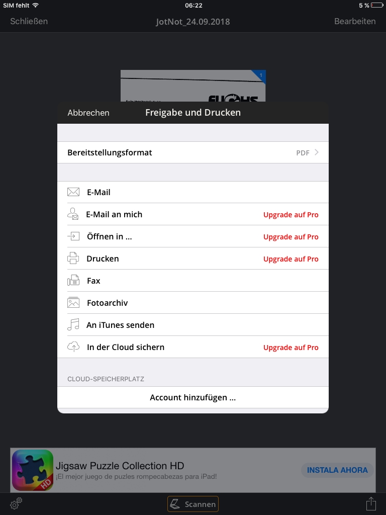 Mit dem „JotNot Scanner“ kannst Du Dir ein Scangerät sparen. Der Scanner für das Smartphone macht aus Fotos PDFs und JPGs und ermöglicht es Dir, diese direkt per Mail, Fax oder Messenger zu verschicken. Gibts für Android und Apple.