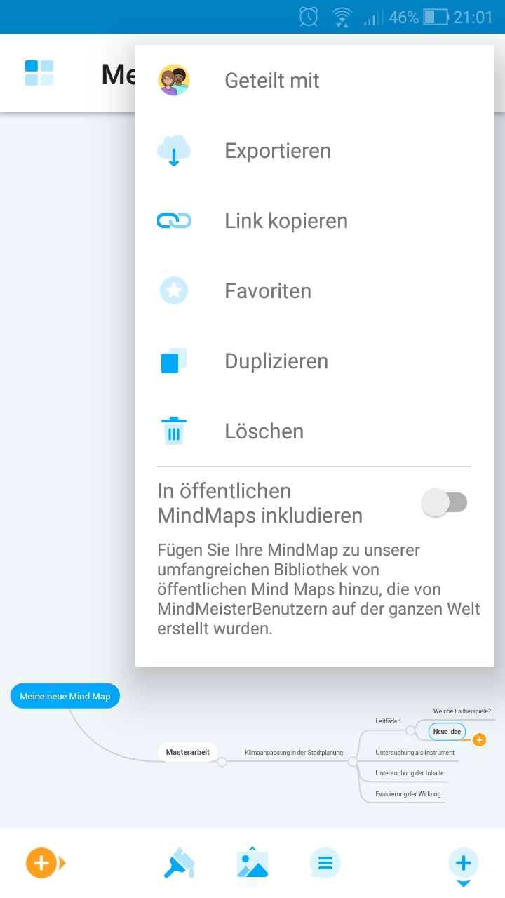 „MindMeister“ ist eine App für digitales Mindmapping. Mit der App können Mindmaps erstellt, gespeichert, bearbeitet, geteilt und in verschiedenen Dateiformaten gespeichert werden. Gibts für Android und Apple.