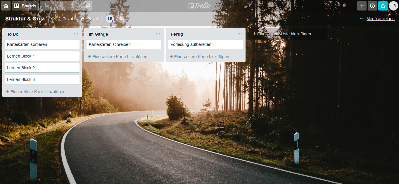 „Trello“ ist ein Online-Tool, das die Organisation von Aufgaben erleichtert. Mit Trello kann man individuelle Boards erstellen und diese bei Bedarf mit anderen Personen teilen. Es ist vergleichbar mit einer Art Online-Pinnwand, die man selbst bestücken kann, um sich entweder To-Do-Listen zu erstellen, eine Auflistung von Erinnerungen, Terminen und Aufgaben zu erhalten oder auch einen Einkaufszettel mit der eigenen WG zu teilen. Gibts für Android und Apple.